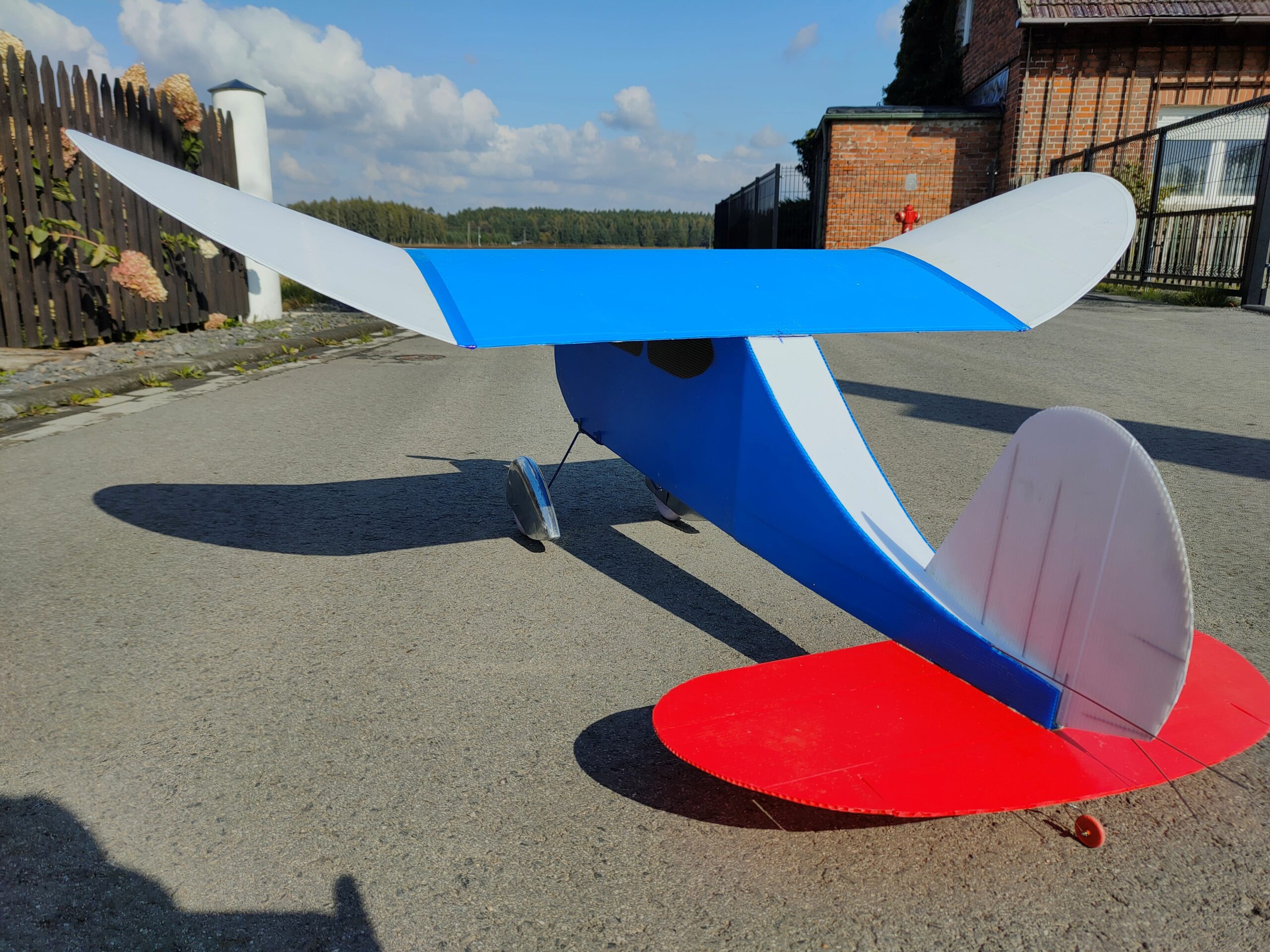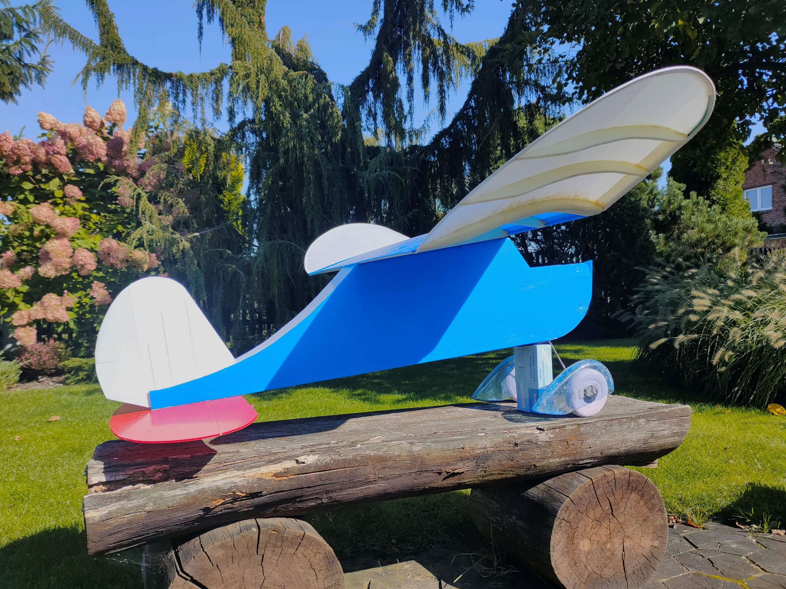 This is my version of the OLD FOGEY, 33% larger than FT foam original. It’s made of Correx 2mm, exept red horizontal stab- its from 3 mm. Wing has a modified profile – a curve, not angular. Bamboo reinforcement in center wing (5 mm stick for orchid flowers), and some inside front of fuse, and sticks for barbecue in both stabs. Span 1260 mm, weight 1140 grams. Depron rips in wing, two formers in fuselage also Depron.