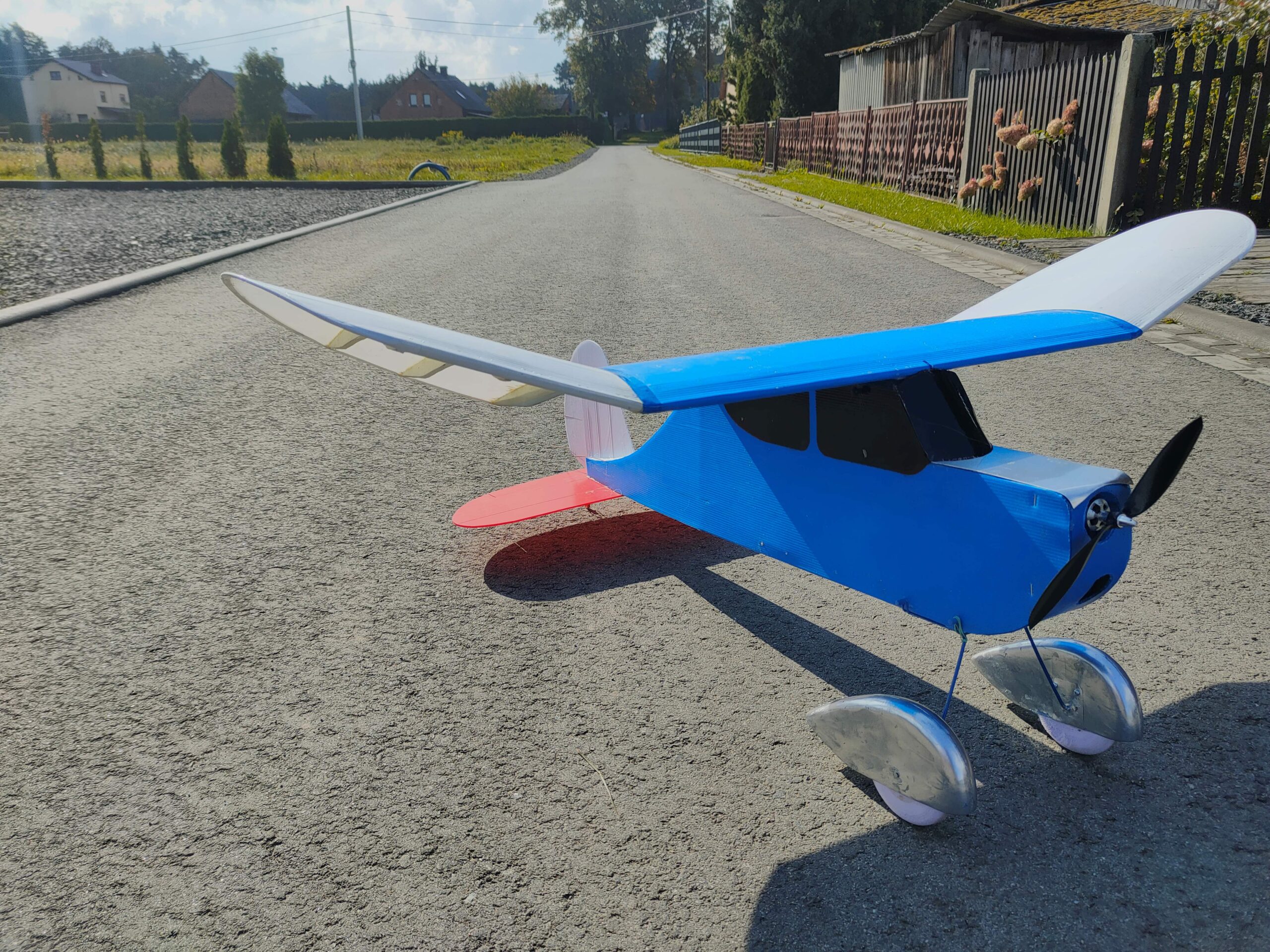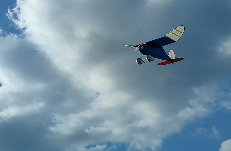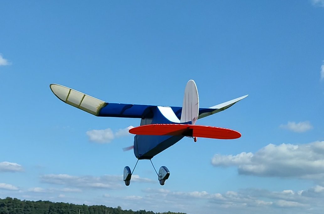 At first, Fogey flew constantly as if in “wingover mode” (constantly rocking laterally). I limited radicaly rudder deflections, and it’s fine. The 420W motor (3S 2200 battery) isn’t excessive – model has significant drag.